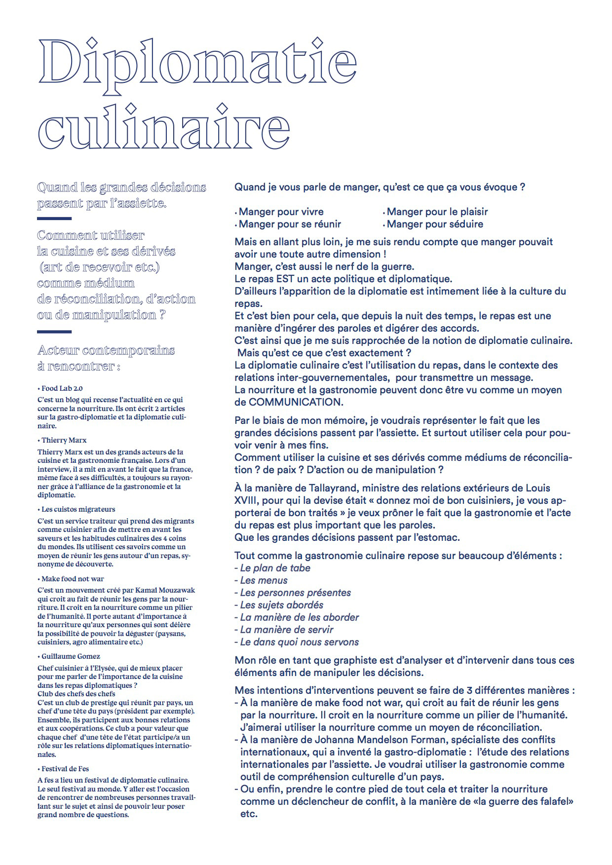 Dans le cadre de mon sujet de mémoire, je me suis m'intéresse à la diplomatie culinaire, à "comment les grandes idées passent par l'assiette".