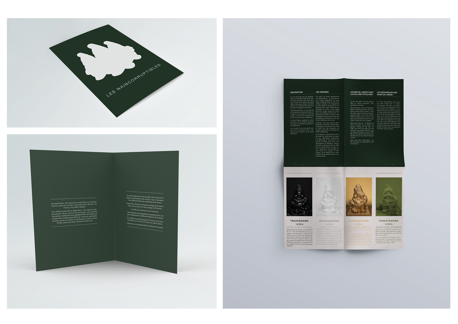 Il y a longtemps, le nain de jardin a été créé en tant que représentant figuratif des mineurs. Ceux-ci ont été utilisés pour les défendre contre les forces maléfiques de la nature. Aujourd'hui, l'homme n'est plus à protéger de la nature, mais la nature à protéger de l'homme. En effet, les tendances se sont inversées. Cette expérience photographique permet donc à ces nains de représenter les différents éléments de la nature. Par la taille de ces photographies, l'homme est face à sa bêtise, et le nain est ici en dénonciateur. Chaque nain est représentatif d'un élément de la nature