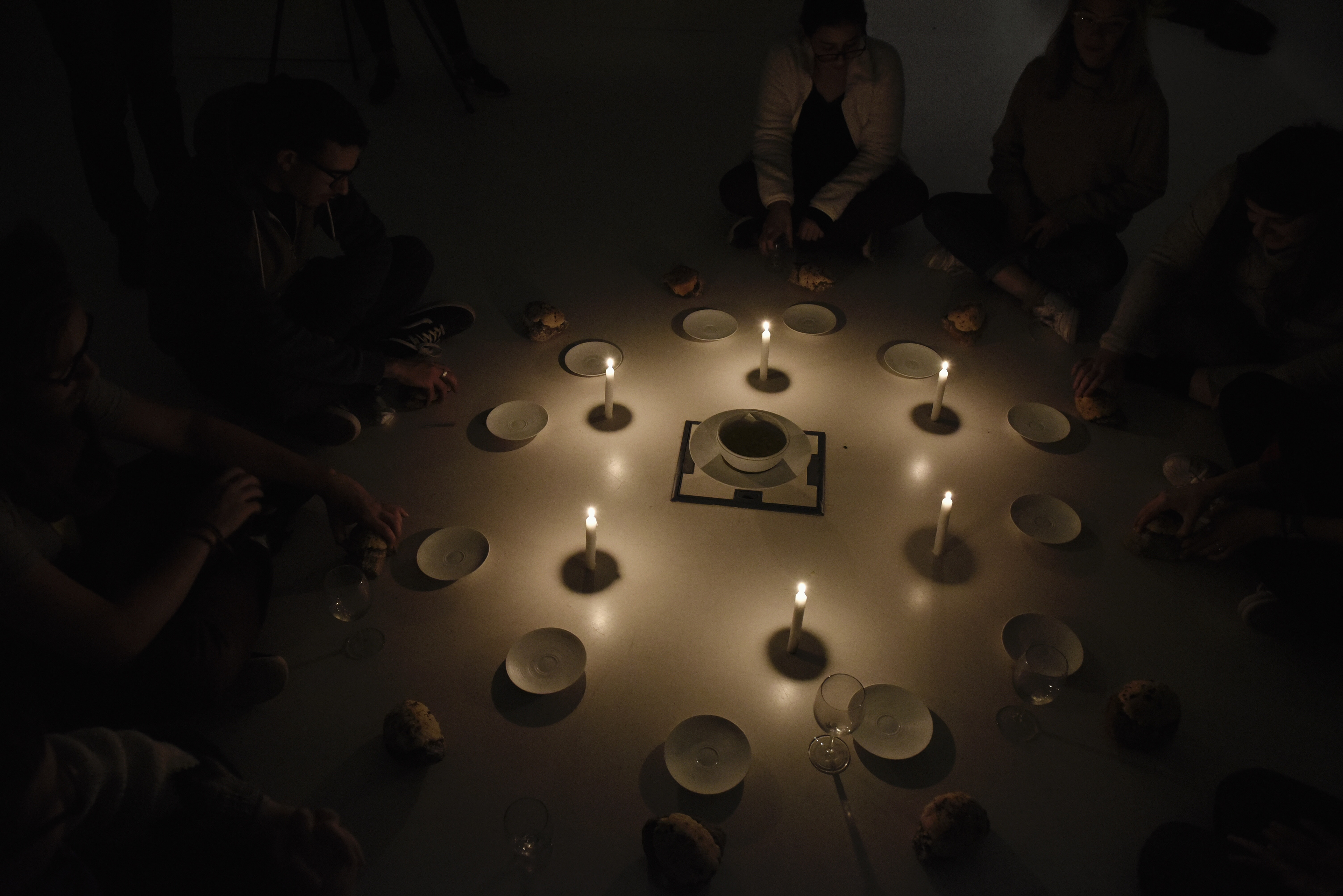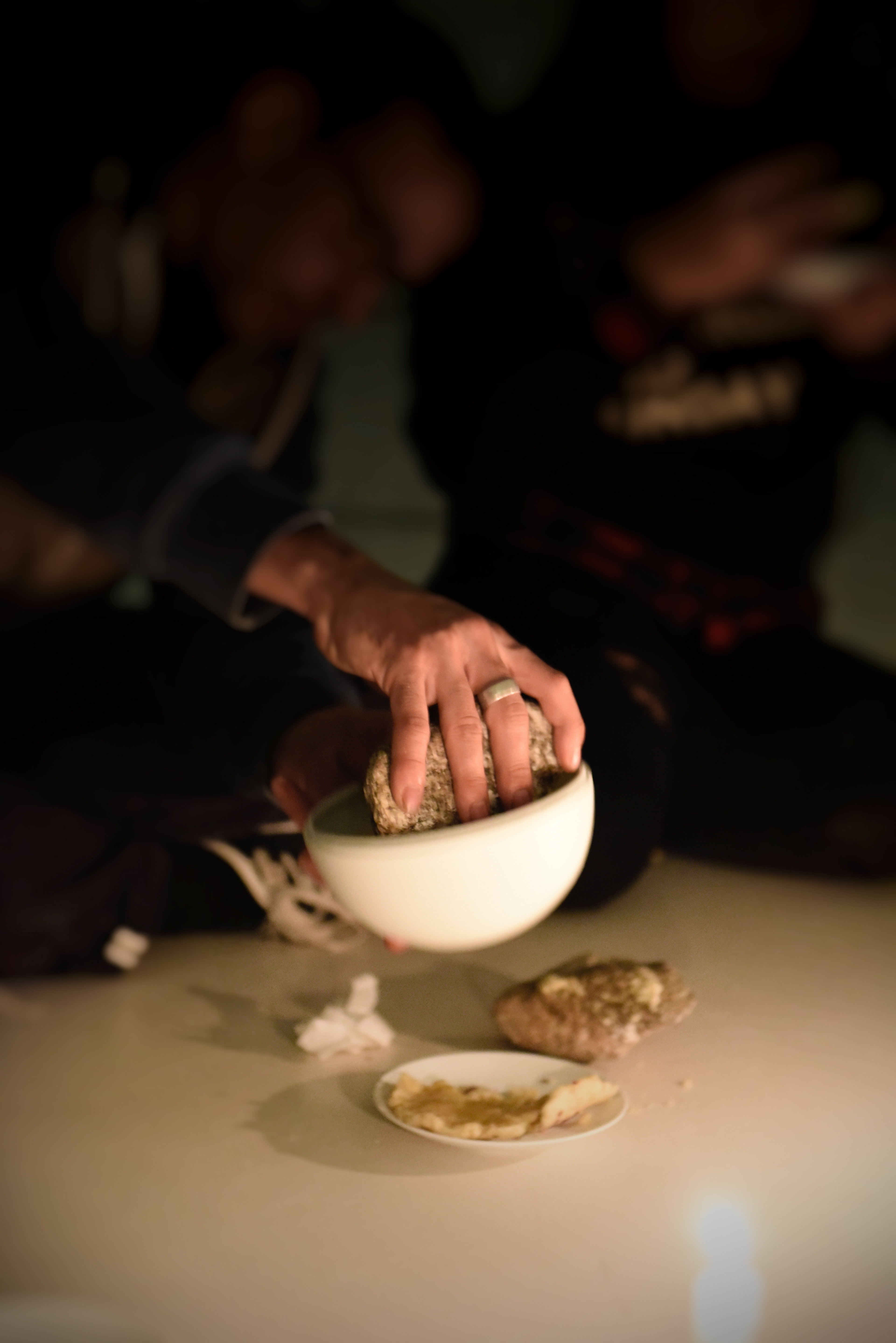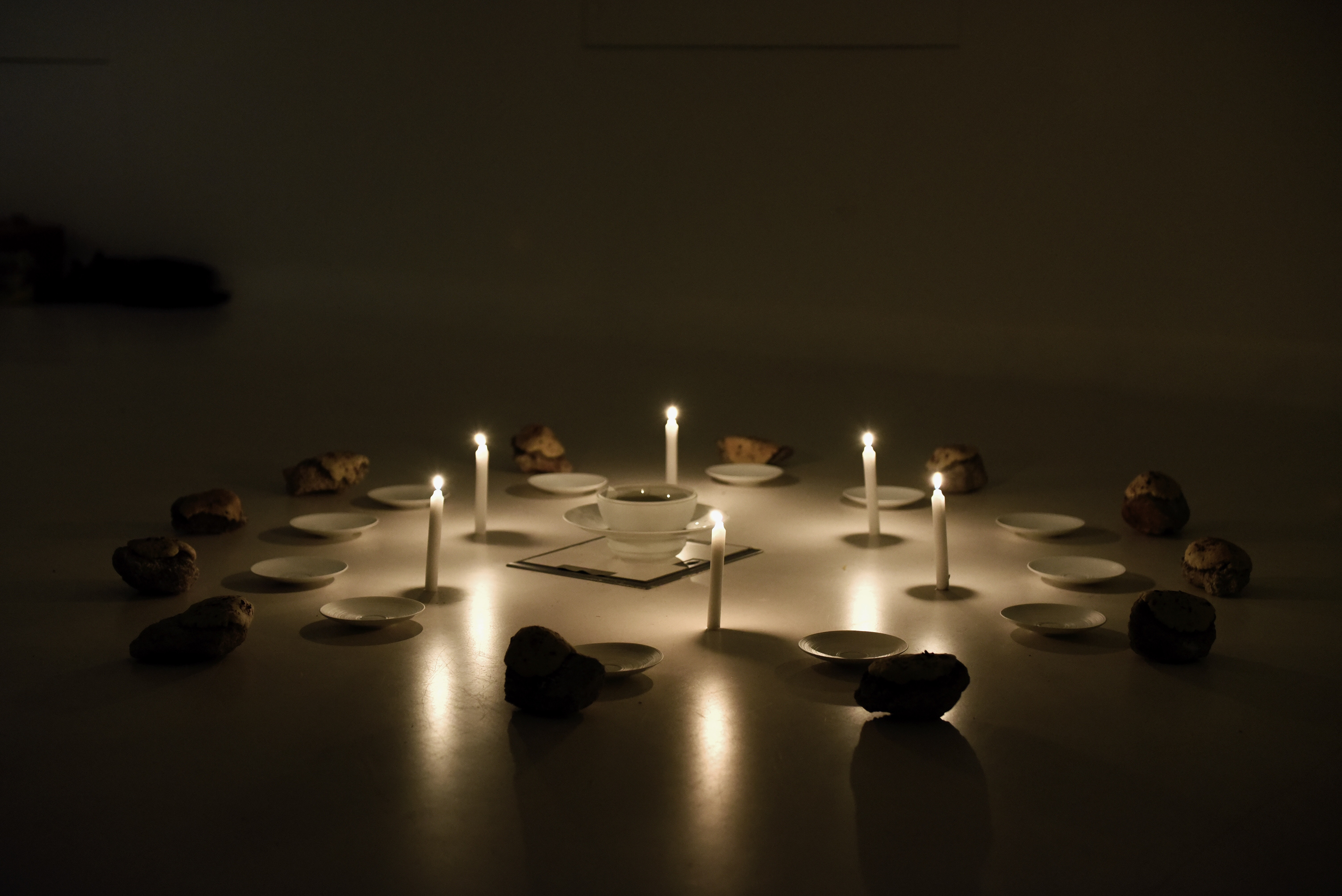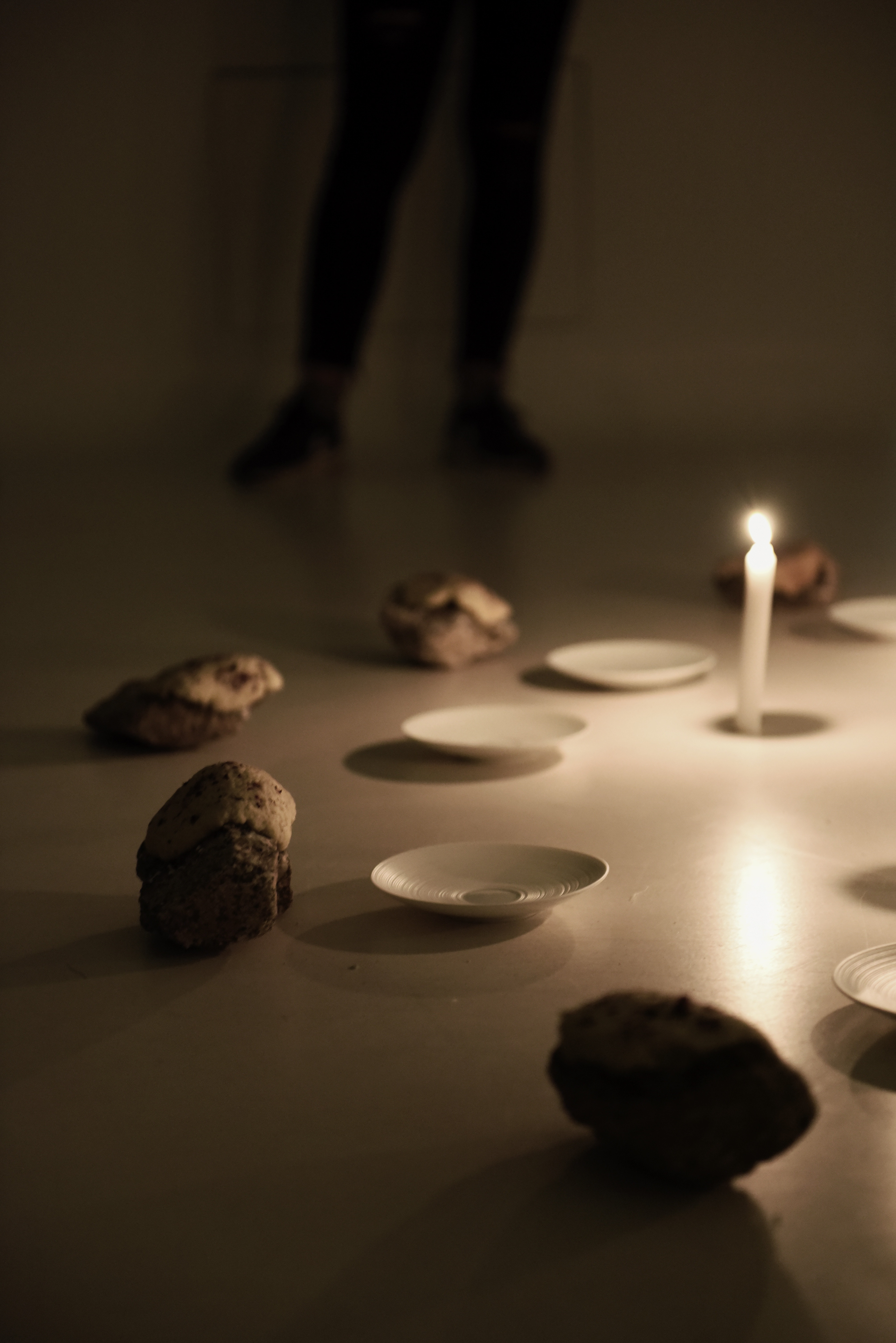 Nous nous sommes intéressées au restaurant de l’île de Vassivière et en particulier au nom de celui ci : Manger l'île. Et nous avons décidé de prendre cette thématique comme axe de recherche pour le repas expérience. Nous avons introduit au sein de la réalisation de notre repas les thèmes de presser / repousser/ couler. Ceux ci s’expriment et prennent sens lors de la réalisation et la mise en place des aliments. Nous avons réalisé des sablés aux fleurs de mauves, (acquises chez Thierry Thévenin, herboriste, basé dans la région de Vassivière), et au gingembre. Ceux ci, PRESSÉS sur des « pierres » récoltées aux abords du lac de Vassivière. Ensuite, le but était de REPOUSSER cette pâte sur les pierres récoltées afin de faire cuire les biscuits sur la pierre et de mettre en avant l’idée de « manger sur l’île ». Et enfin on venait presser la brunoise d’ananas afin de faire COULER le sirop sur le biscuit. L’installation se trouvait sur le sol, dans une ambiance intimiste.